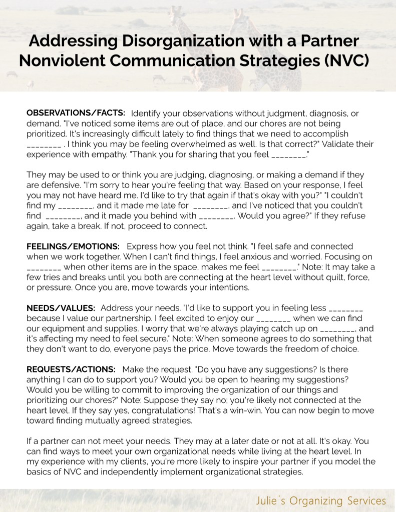 I’m thrilled to provide the worldwide peacemaker, psychologist, mediator, author and teacher Marshall Rosenberg, Ph.D’s Nonviolent Communications methods as a Professional Organizer to my clients. I am currently not certificated as an NVC coach. My experience is based on my own understanding of Nonviolent Communication as it relates to home and office organizing.
